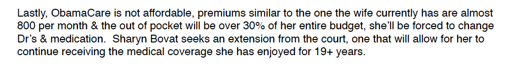the below paragraph is included in a letter to the court.... i know I'm not the 1st woman whose been harmed by outrageous premiums, large deductibles & a "small list" of available doctors. How difficult would it be for Congress to make a law that says women married over 10 years or 19 years get to keep their spouses program?